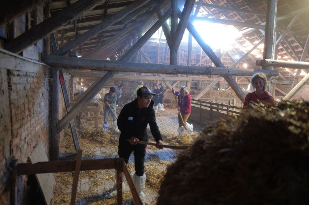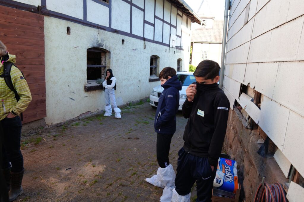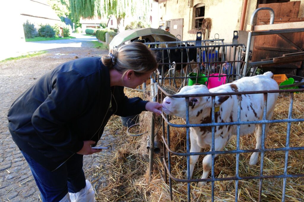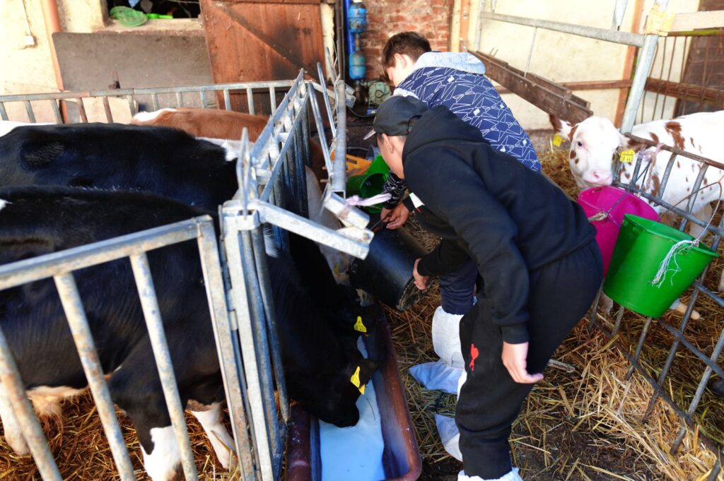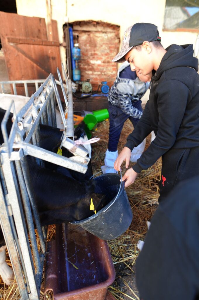 Jugendliche von der Carl-Schomburg-Schule Kassel (CSS) kamen um 09:00 Uhr in Albshausen auf dem Hof an und begannen sofort mit der Mitarbeit im Hofalltag. Etwas zu spät für die Kühe, aber gerade noch rechtzeitig haben die Schülerinnen und Schüler es geschafft, unter der Anleitung von Anita Kelmendi zwei der Kühe zu melken. Anitas Schwester Ute Ebel bereitete zur gleichen Zeit mit einigen der Jugendlichen den Stall vor, in dem sie Stroh vom Heuboden in den Stall beförderten. Nach der Arbeit im Stall wurde die Kuhherde auf die Weide getrieben. Einige der Jugendlichen halfen noch tatkräftig dabei, die Kälbchen zu tränken.