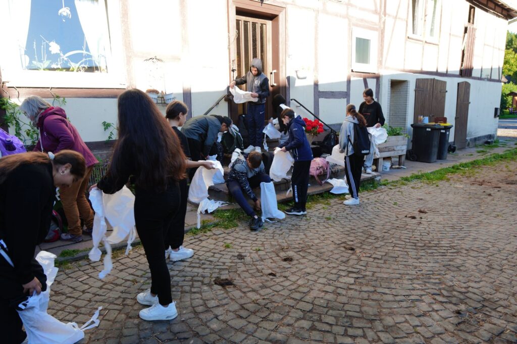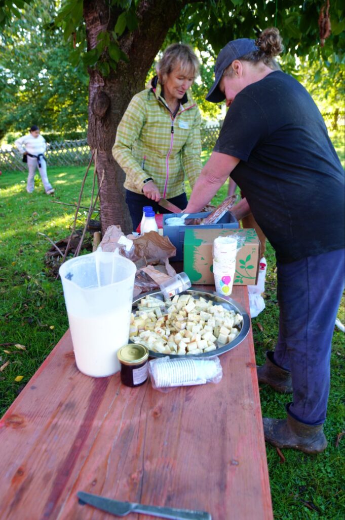 Die Arbeit war zwar noch nicht vollends geschafft, aber auch die Menschen brauchten ein kleines Frühstück. Käse, Joghurt, Apfelsaft und Milch direkt vom Hof halfen dabei die Helferinnen und Helfer für die weitere Aufgabe wieder aufzurichten.